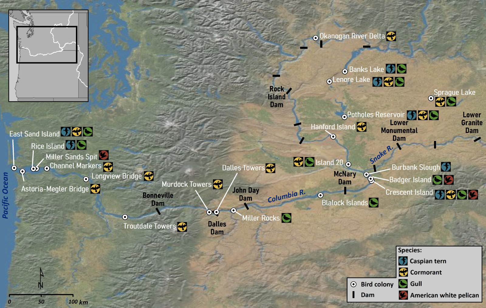 Our research spans key regions along the Pacific Coast, including the Columbia Basin and selected sites in Oregon, Washington, and California. Study areas include major river estuaries, coastal wetlands, and inland water bodies that support colonies of Caspian terns, double-crested cormorants, American white pelicans, and several species of gull. These sites are carefully selected to represent a range of habitats where piscivorous waterbirds interact with juvenile salmonids, allowing us to monitor population trends, feeding behaviors, and the impacts of avian predation on fish recovery efforts.